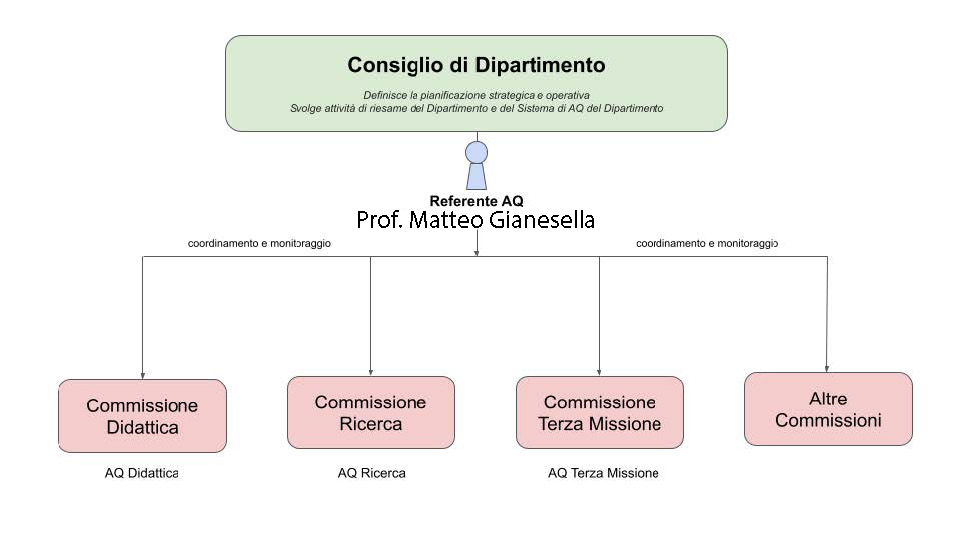 - Referente AQ: coordina le attività di AQ e svolge un ruolo di raccordo con il Consiglio di Dipartimento. Il ruolo di referente AQ può essere svolto da Direttore o un suo delegato.